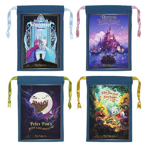 『アナ雪』『ラプンツェル』『ピーターパン』それぞれのエリアのアトラクションのポスターなどが描かれた、きんちゃくのセット。