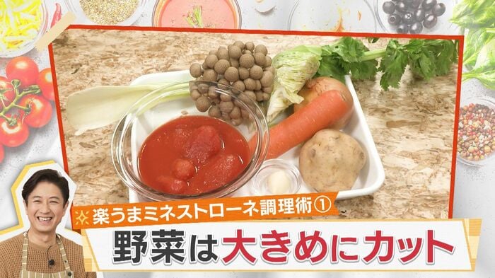 谷原流!楽うまミネストローネ調理術 ポイント①「メイン野菜は大きめに切る」