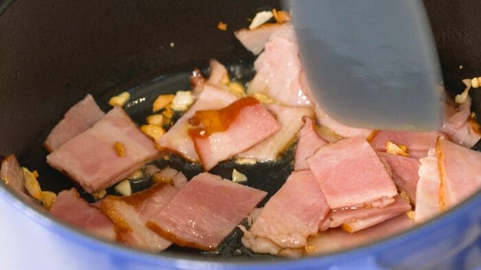 ① 鍋に刻んだニンニク・オリーブオイルを入れ、ベーコンを炒める