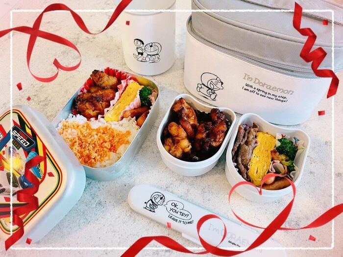 平さんは、ドラえもんが描かれたお弁当箱などに、卵焼きや唐揚げなどが入った写真を投稿。
