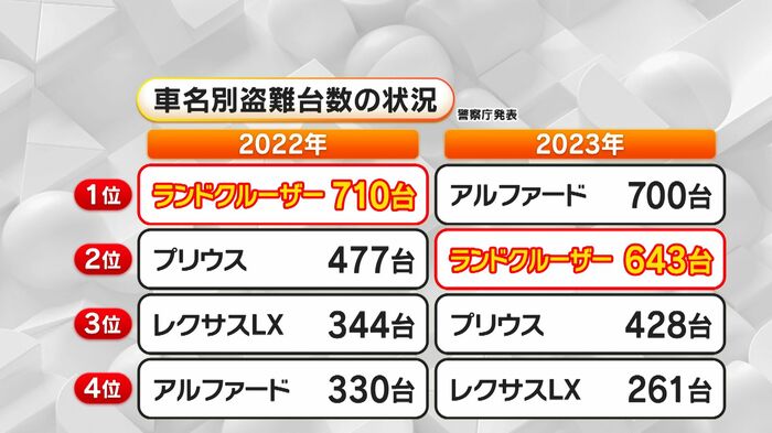 警察庁が発表する車名別の盗難台数状況では、「ランドクルーザー」は2022年に710台で1番、2023年は643台で2番目の盗難台数になっており、他の車よりも多数の被害報告があるといいます。