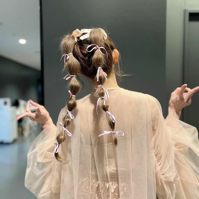 ピンクのリボンをあしらった“タマネギツインテール”姿を披露。