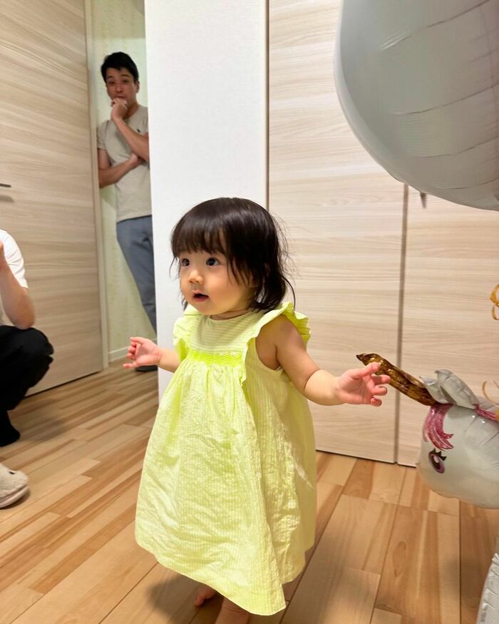 さらに、「(夫である)蒲生さんがかわいいかわいいるりちゃんの挙動を部屋の外から観察してはクスクス笑ってるのを私は見逃さなかった笑」とのコメントと共に、夫でレーシングドライバーの蒲生尚弥さんが親友の子どもを見つめる写真も公開しました。