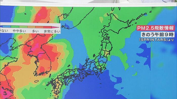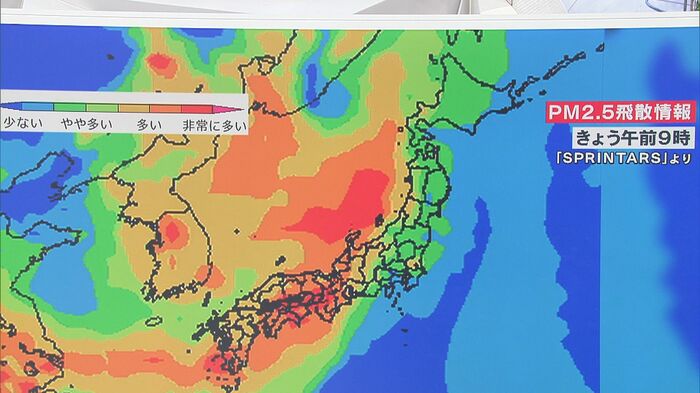 毎日実は“PM2.5”って少しは飛んできているんですが、きょうは特に黄砂と一緒に混じっています。黄砂が多いときにはこの時期PM2.5も非常に多くなるということで、特に呼吸器疾患などがある方は健康管理に気をつけていただきたいと思います。