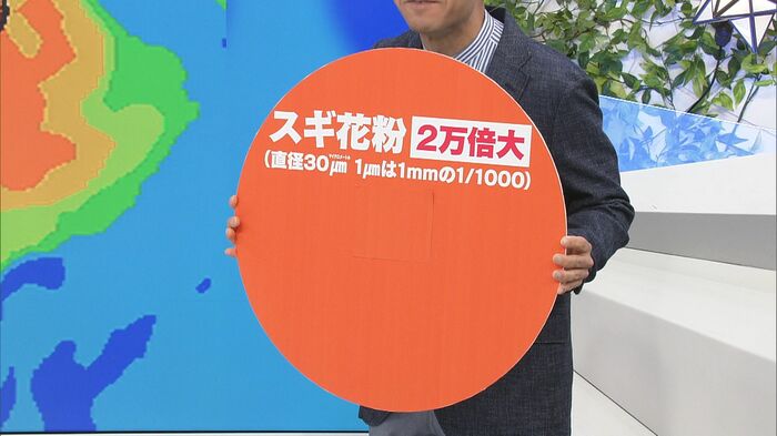 PM2.5はなぜ今注意が必要かというと、その大きさなんですよね。例えば、こちらが実際の2万倍のスギ花粉です。スギ花粉って大体の大きさが、30マイクロメートルといって、1ミリの100分の1くらいです。十分小さいです。目で見ようと思ってもなかなか1つ1つは見えない。