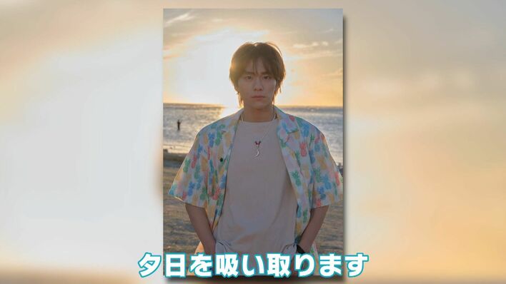 赤い夕日を吸い取るような海をバックに撮影された写真や…