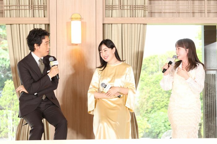 大泉さんの妻役を演じる菅野さんも、「クランクインも雨だったような気がします。雨降って地固まるでお届けしたいと思います」と笑顔で返し、大泉さんは「まさにその通り!」と合いの手を入れました。