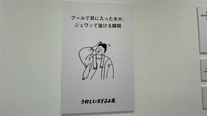 「プールで耳に入った水が、ジュワッて抜ける瞬間」と、耳から水が出て気持ちよさそうな顔をする男性が描かれています。
