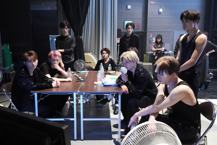 「Kiss Me Baby」では、ユーキさんが「9人体制での撮るのは新鮮ですね!」と心境を。「Lesson Ⅱ」のリハーサル終了後には、リーダー・リョウガさんからメンバーたちへ「ラスサビのタイミングが(合っていない)…」と指摘が。本番に向けて修正していきます。