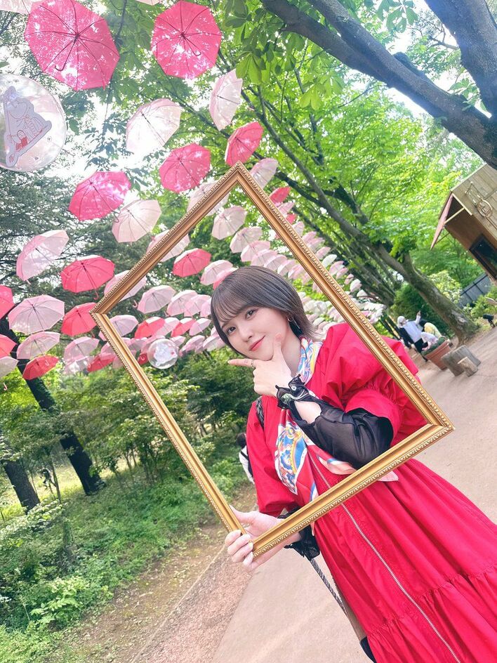 薄ピンクや赤い色など透明な傘がたくさん飾られたエリアでは、鬼頭さんは金色の額縁を持ち、顎に指を当てポーズを決めていました。