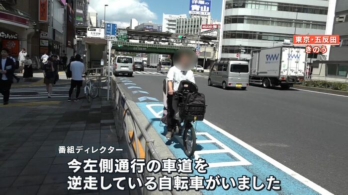 他にも、左側通行の車道を“逆走”する自転車や…、停止線を越えた位置での停止。