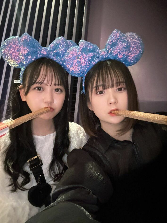 投稿された写真では、青のスパンコールのカチューシャでおそろいにした2人が、チュロスをくわえながらカメラを見つめるかわいらしい“あざとショット”が!