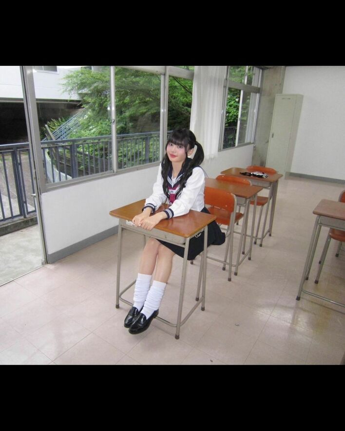 教室で椅子に座って微笑んでいるショットでは、ルーズソックスを履いたJKスタイルも披露しています。