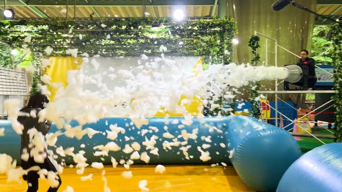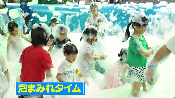 こちらは名物の「泡まみれタイム」で、何もなかったプールが一瞬にして、一面泡だらけに様変わりしました。