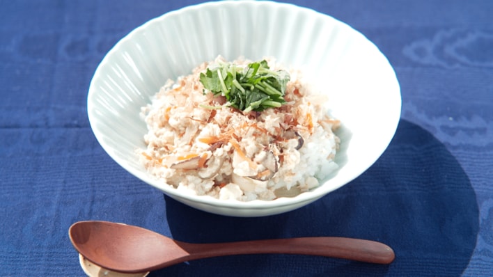 ご飯の上にかけたら、あっという間に「重ね煮の炒り豆腐丼」の出来上がり!「いい香りがしています」と頬張った松岡さんは、「重ね煮のだしが効いている」と笑顔に。