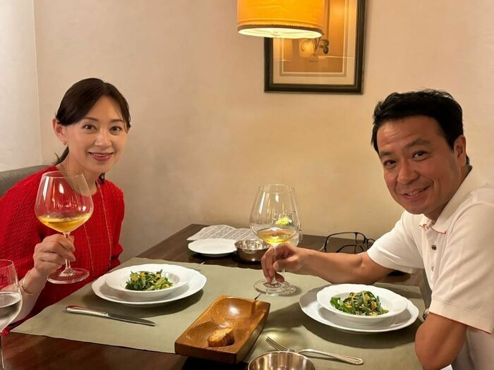 投稿された写真には、夫婦でワインを片手に持ち、笑顔を見せたツーショットが。