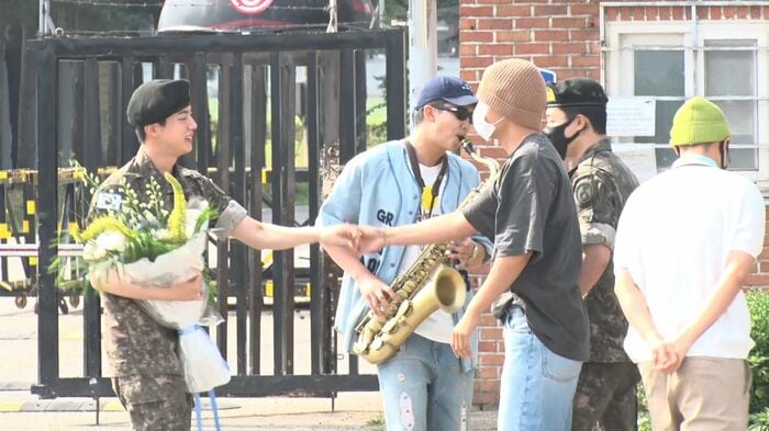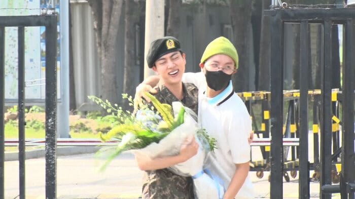 JINさんの除隊に、BTSのメンバーであるRMさん、J-HOPEさん、Vさん、ジミンさん、ジョングクさんの5人が集まり、サプライズでJINさんを出迎えました。
