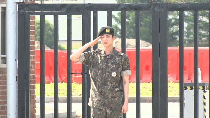 そこに軍服を着たJINさんが出てくると、報道陣に向かって敬礼し手を振って挨拶。