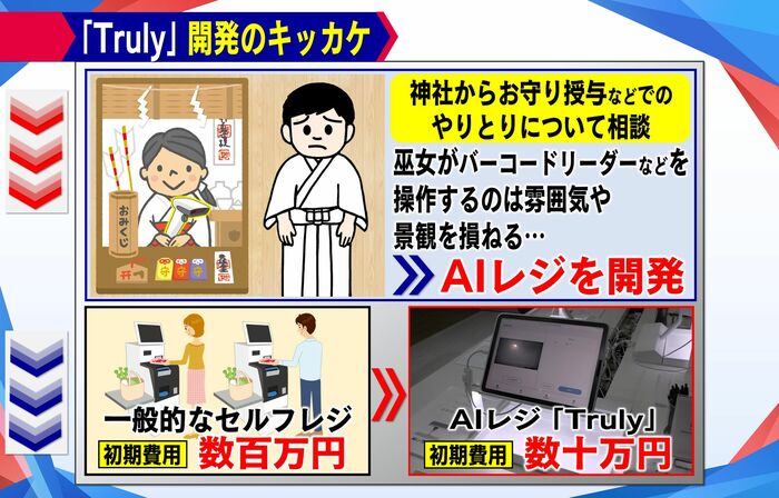 神社の社務所でお守りを買う際、巫女がバーコードを読み込んで操作していると景観に合わないことから、何か良い方法はないかという相談から開発がスタートしたのだといいます。