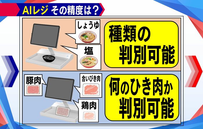 精度は、例えばラーメンを置くと「しょうゆ」や「塩」などの種類の判別も可能です。ひき肉で試してみたところ、豚肉や鶏肉、合いびき肉など、何のひき肉かの判別も可能でした。