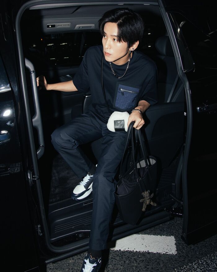 さらに、「FF」ロゴと「オーロック」モチーフのイヤリング、「FENDI」のレタリングが施されたシルバージュエリーを着用し、おにぎり型のミニバッグとクマ型のチャームを取り付けた「ゴー トゥー ショッパー」を身に着け、遊び心のあるスポーティなスタイルを完成させました。