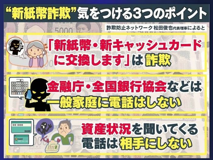 気をつけるポイントは大きく3つあります。1つ目は、「新紙幣、新キャッシュカードに交換します」といった話が出たら、それは間違いなく詐欺だと思っていただく。2つ目としては、金融庁・全国銀行協会から一般家庭に電話がかかるということも一切ございません。最後に、資産状況について確認するような電話がありましたら、こちらも詐欺だというふうに疑っていただいて、電話を切っていただく。こういったことがとても大切なことだと思います。