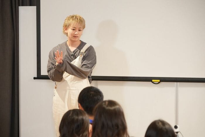 また、制限時間ギリギリまで熟考していたリョウガさんの授業は「人生をハッピーにさせるライフハック」。「30年近く生きてきて、他の人におすすめしたいと思った“裏技やおすすめ”を教えたいと思います!」といい、役立つライフハックを次々と紹介。「皆さんは神社に行ったことありますか?」「好きな食べ物、ある?」「じゃあ、次は僕とジャンケンをしてほしい。でも、1回目はグーを出してほしい!」などなど、テンポよくトークを繰り広げますが…!?