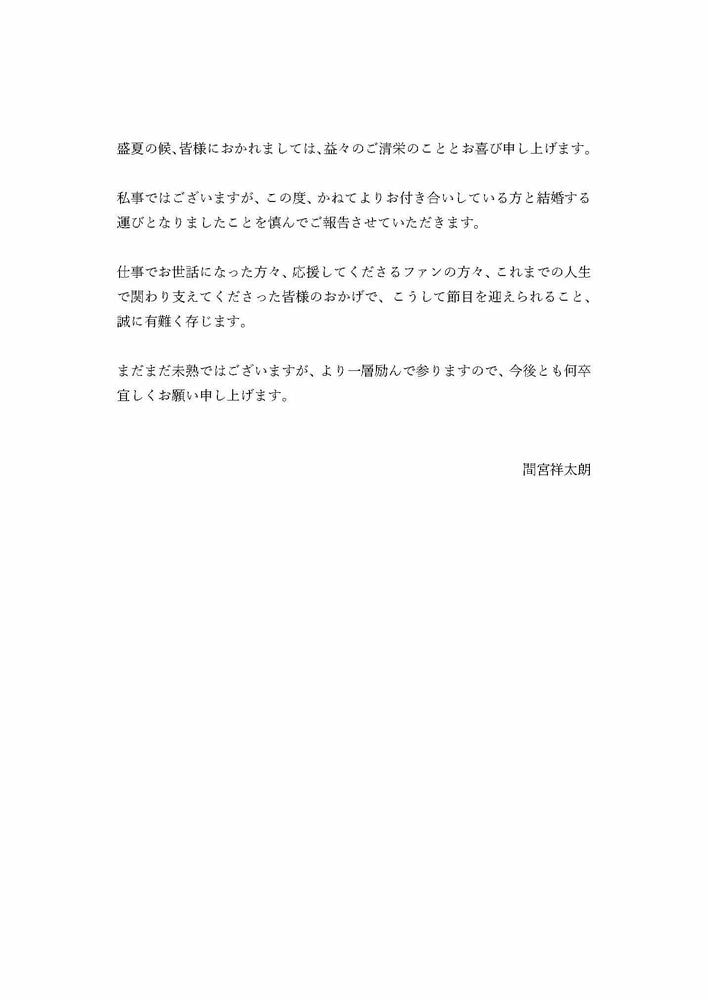 間宮さんは公式サイトを通じ「私事ではございますが、この度、かねてよりお付き合いしている方と結婚する運びとなりましたことを慎んでご報告させていただきます。」と発表。「まだまだ未熟ではございますが、より一層励んで参りますので、今後とも何卒宜しくお願い申し上げます。」と今後について意気込みをつづりました。