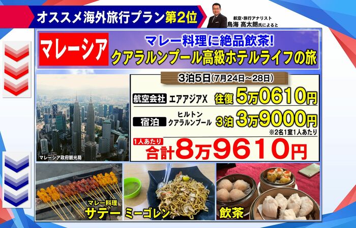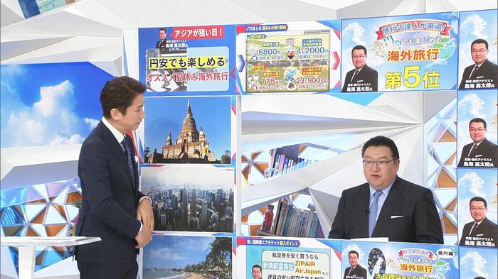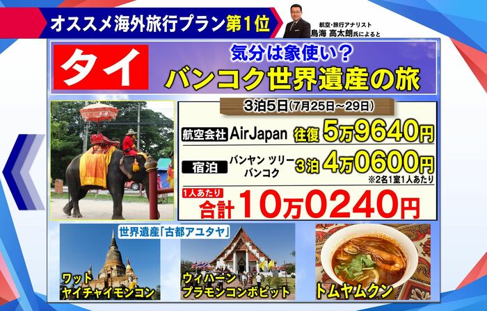 なので、夏休みでも往復6万円以下で航空券が買えちゃうと。コロナ前でもここまで夏が安かったことはないので。(滞在費は)タイは比較的電車でも移動できますし、食費なんかも安いというのもあります。