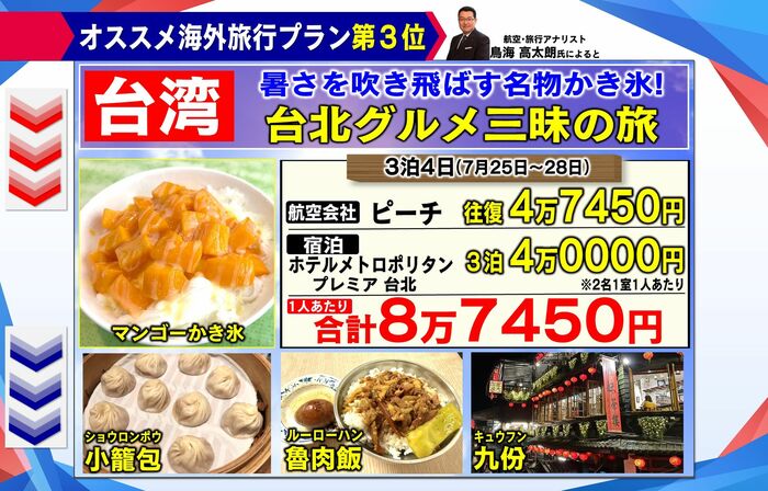 【楽しみ方】 この時期のマンゴーかき氷は最高。もちろん台湾での小籠包、魯肉飯など台湾グルメも堪能し、足裏マッサージで癒やされ、九份の夜景、時間があれば北投温泉でゆっくりお風呂に浸かるのもおすすめ。