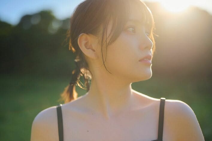 夕日を背景に、鬼頭さんが遠くを見つめる透明感のある姿も!