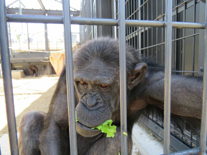 葉っぱを食べながら、カメラに向かって凜々しい表情を見せるのは22歳のメスのチンパンジー、ナナコちゃん。