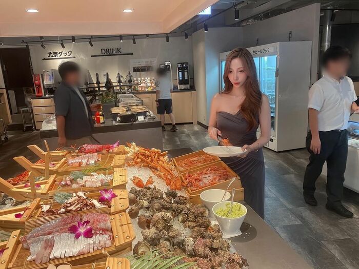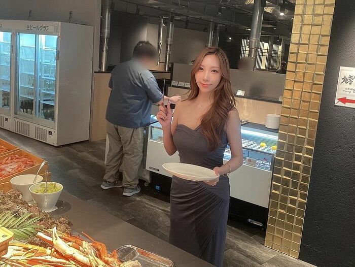 ものまねメイクタレントのざわちんさんが2024年7月28日に自身のインスタグラムを更新し、ノーマスクとドレスアップした美しいスタイルでビュッフェを楽しむ姿を公開しました。