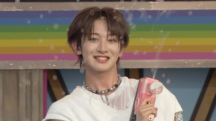 メンバーたちがタオルを持って歌う中、NAOYAさんはピンク色の鉄砲を持って観客やメンバーに向けてシャボン玉をかけるおちゃめな姿も見せました。