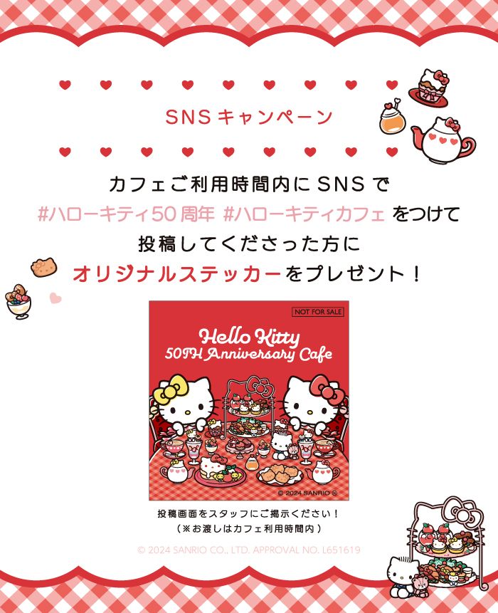 XまたはInstagramでカフェ店内もしくは飲食メニュー写真に「#ハローキティ50周年」「#ハローキティカフェ」をつけて投稿していただいた方に先着で「ステッカー(全1種)」をお1人様につき1枚プレゼント。※なくなり次第終了