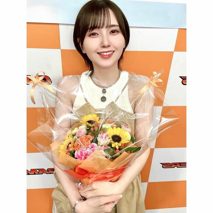 両腕でお花を抱えて微笑む姿や、両腕を上げて頭の上にフォトブックを掲げるショットなどを見せ、さらに「そういえばしれっと髪切りました」と髪を切ったことも明かしていました。