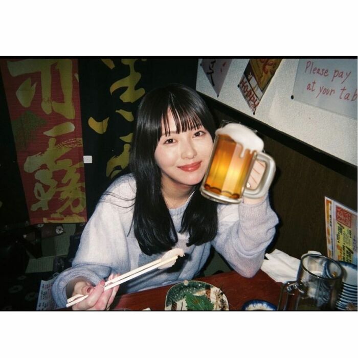 また、お店で食事を楽しむショットでは、ニッコリとほほ笑んでいます。飲み物を持った部分にはビールの絵文字がつけられていました。