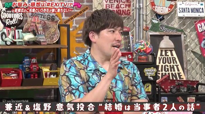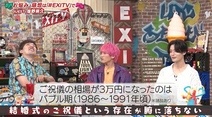 EXITがゲストとリラックスしたトークを繰り広げる『EXITV』(フジテレビ)。9月3日の放送では、ゲストに迎えた塩野さんから寄せられた相談「結婚式のご祝儀という存在がちょっと腑に落ちない時がある」をテーマにトークを繰り広げました。