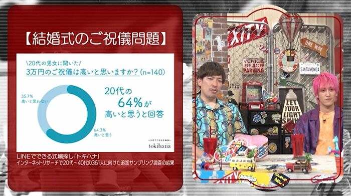 20代の男女へのアンケートで、64%が3万円のご祝儀を「高いと思う」と回答していると紹介されると、「手取り22万とか18万の層からするとたまったもんじゃない」とアンケート結果に見入る兼近さんと塩野さん。