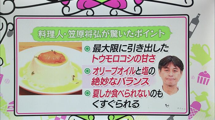 笠原さんは、「白いとうもろこしの冷奴生うにのせ」で驚いたポイントとして、「最大限に引き出したトウモロコシの甘さ」「オリーブオイルと塩の絶妙なバランス」「夏しか食べられないのもくすぐられる」と明かしました。