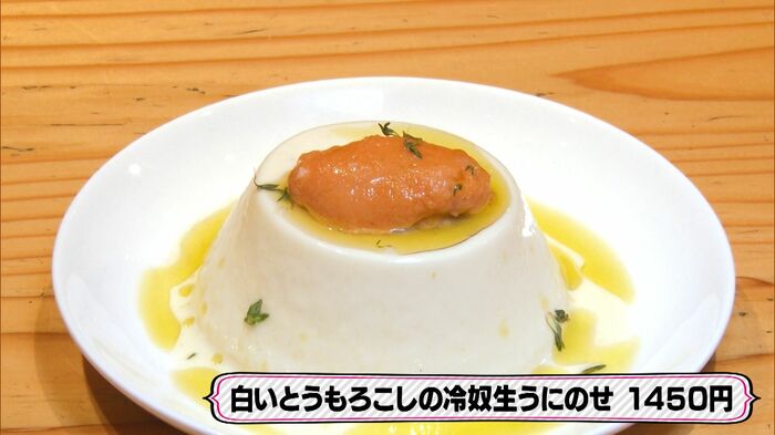 笠原さんのおすすめは、「白いとうもろこしの冷奴生うにのせ」(1450円)。