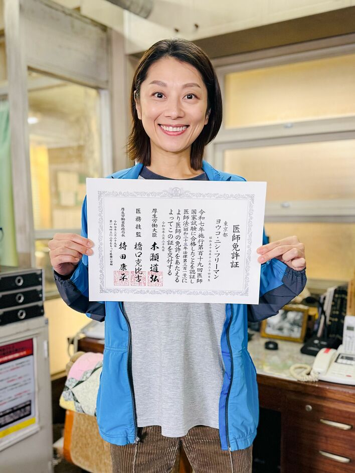 医師免許証を手に、晴れやかな笑顔を見せる、ヨウコ役の小池さん。