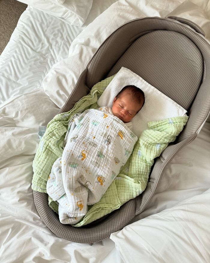 「出産して育児が始まり1ヶ月半が経ちました。使ってみて良かったものご紹介」というコメントと共に7つのベビー用品を紹介するとともに、ベビーベッドで寝る第1子の寝姿の写真を投稿しました。