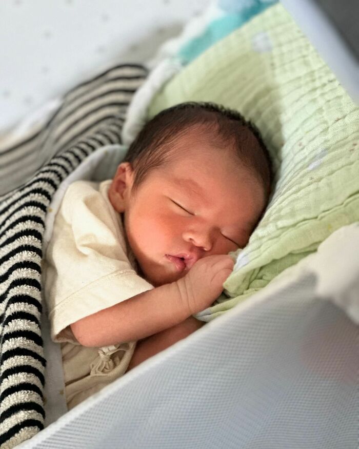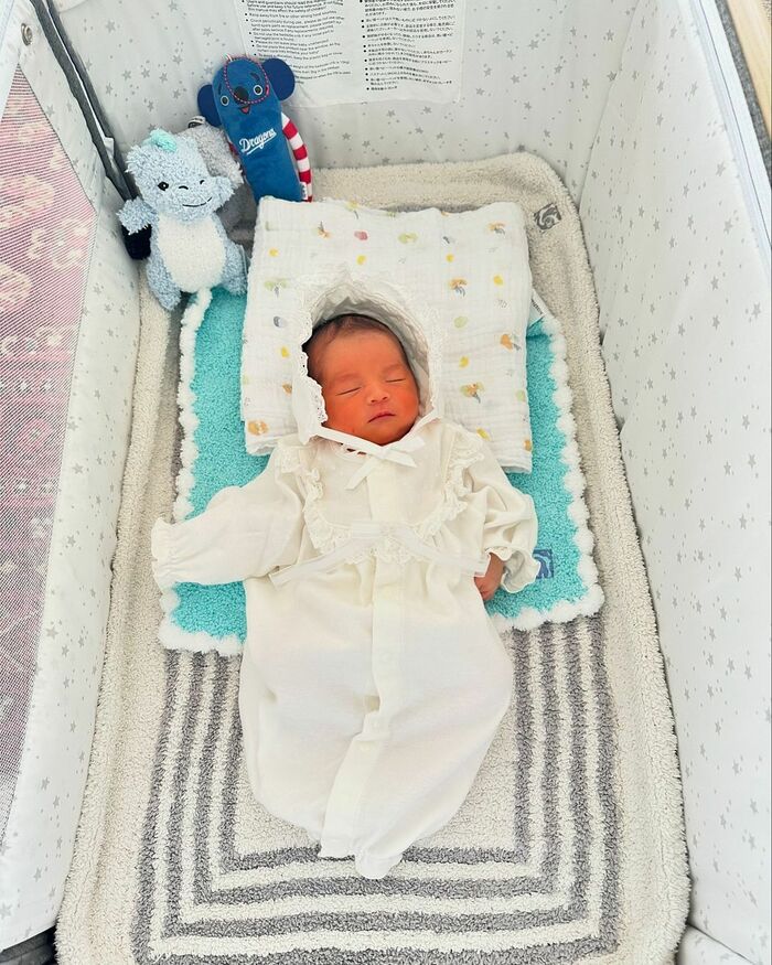 ベビーベッドで眠る写真については「まだ黄疸が出てる頃で肌が少し黄色いなぁ。黄疸の数値が少し高くて心配していた生後間もないあの頃。懐かしい。懐かしいと思えることが嬉しい」と1カ月半の育児生活での苦労を懐かしみました。