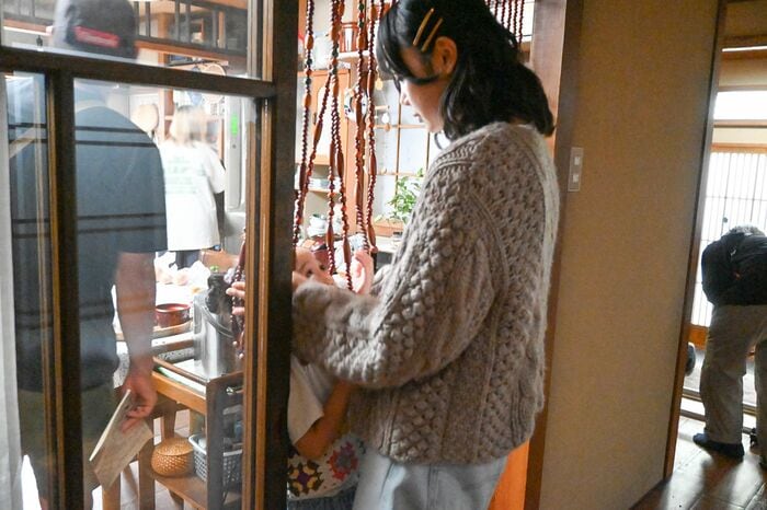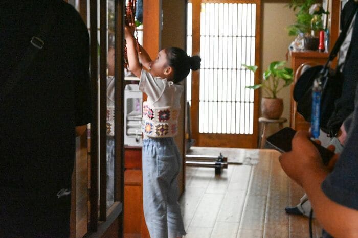 この日は南雲家での撮影。段取り(カメラなしのリハーサル)の準備中、泉谷さんは美術セットの、珠(たま)のれんをなでたり、カチャカチャさせてみたりと興味津々な様子です。