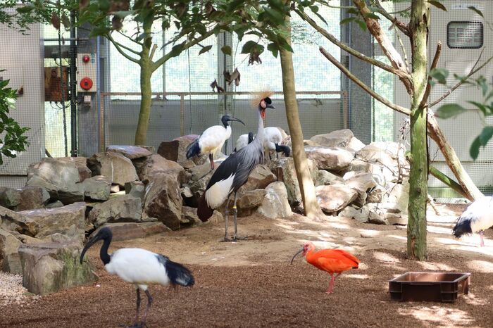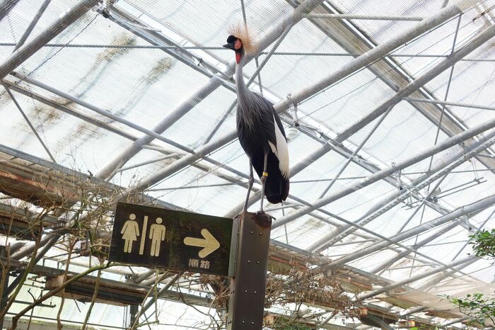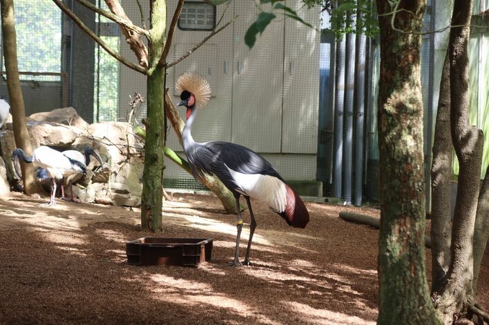 ツルの仲間では珍しく木にとまることができる種類で、「カカ」は水鳥温室に入ってすぐの案内板の上がお気に入り。気性が荒い性格のため他の鳥をよく翼を広げて威嚇し追い立てているんだとか。