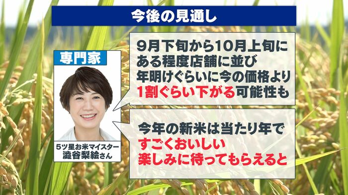 また、5ツ星お米マイスターの澁谷梨絵さんによると、今後の見通しについて「9月下旬から10月上旬にある程度店舗に並び、年明けぐらいに今の価格より1割くらい下がる可能性もある。今年の新米は当たり年ですごくおいしい。楽しみに待ってもらえると」とのことです。