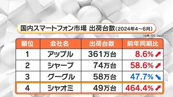 2024年4月から6月の期間、3位の「グーグル」が 2023年の同じ時期と比べて半減に近い一方、 4位の中国発「シャオミ」は464.4%増と、急成長しているのです。