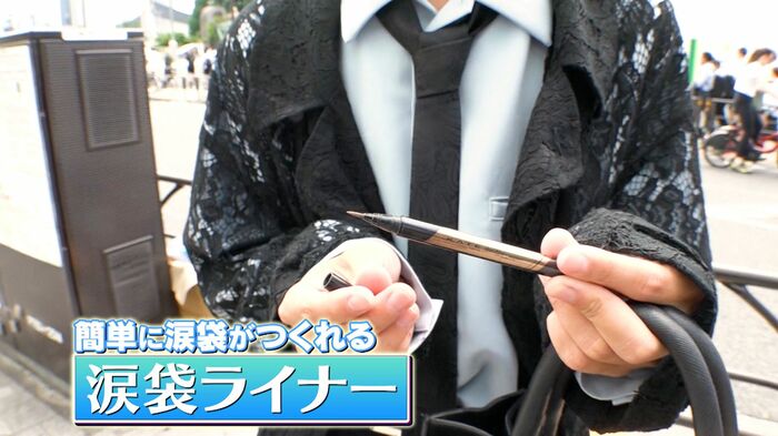 こちらの専門学生がポケットから取り出したのは、簡単に涙袋がつくれるその名も「涙袋ライナー」。落ちてしまう涙袋をこれでたまに描き直すのだといいます。