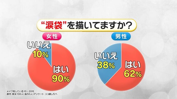 メイクをしている10代・20代にアンケートをとると、涙袋を作っている人は女性で90%、男性で62%という結果になったんです!